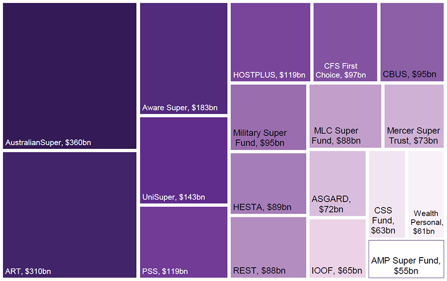 The Superannuation funds with FUM over $50 billion as at 30 June 2024 are: AustralianSuper $360bn, ART $310bn, Aware Super $183bn, UniSuper $143bn, PSS $119bn, HOSTPLUS $119bn, CFS First Choice $97bn, CBUS $95bn, Military Super Fund $95bn, MLC Super Fund $88bn, HESTA $89bn, REST $88bn, Mercer Super Trust $73bn, CSS $63.0bn, Asgard $72bn, AMP Super Fund $55bn, Wealth Personal Superannuation and Pension Fund $61bn
