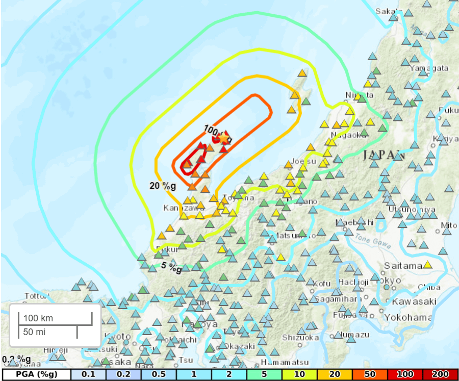 WRN partner Temblor Inc. reports several lower magnitude earthquakes occurred during 2023 (Mw≥4.0, with the largest being Mw6.3 on the 5th May), part of a seismic swarm of >20,000 events and ground uplift recorded since November 2020 (Amezawa et al. 2023, Kato 2023). A Mw5.5 foreshock occurred approximately four minutes prior to the Mw7.5 event, and more than 50 aftershocks of Mw≥4.0 were noted in the following seven days. The largest of these was Mw6.2, occurring ~45km to the south-west of the mainshock and 8 minutes later. The USGS estimates a maximum slip of ~3.5m along the fault, mostly to the south-west of the epicentre where the highest intensities and many subsequent aftershocks were reported.