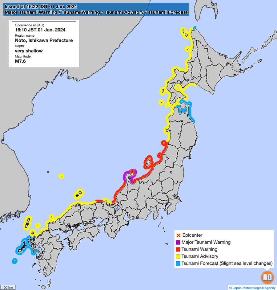 Due to the coastal location of the earthquake, a major tsunami warming was issued for the Noto peninsula and further advisory warnings were issued along much of the west coast (Figure 2). Tsunami waves were reported to reach heights of 1.2m near the city of Wajima, according to the Japan Meteorological Agency, and a research team from the National Building Research Institute and the University of Tokyo modelled wave heights as high as 3.6m in the prefectures of Ishikawa and Suzu. The Earthquake Research Institute at the University of Tokyo found sections of coastline in western Japan had shifted up to 250m towards the sea in some places. The quake was also reported to have caused widespread landslides, and liquefaction in coastal areas to the south of the epicentre.