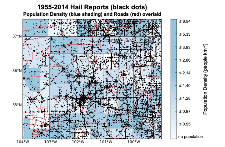 Severe weather events are reported where and when people encounter them. Therefore, we can expect to see more reports in certain locations simply because that location is densely populated. For example, if we map all first-person reports of hail across north Texas (Figure 1), we see that hail appears (incorrectly) to be most common near towns and cities, interstates, and state highways. In addition, there are generally more reports in recent years simply because technologies (such as Doppler radar) and reporting practices have improved through time. How do we account for these “artificial” or unphysical influences that have nothing to do with the real behavior of severe storms?