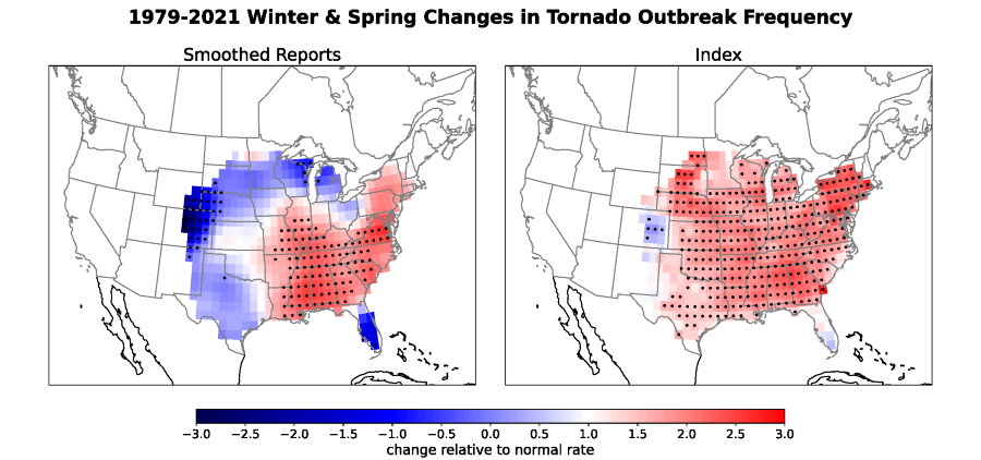 Figure 2: Relative change in the frequency of tornado outbreaks in winter and spring between 1979 and 2021, as represented by geographically smoothed first-person reports (left panel) and our environment-based index (right panel). On both maps, the red shading indicates increasing frequency over the study period, while the blue shading indicates decreasing frequency. The stippled pattern shows those places where observed changes in tornado outbreaks have been statistically different from random chance.