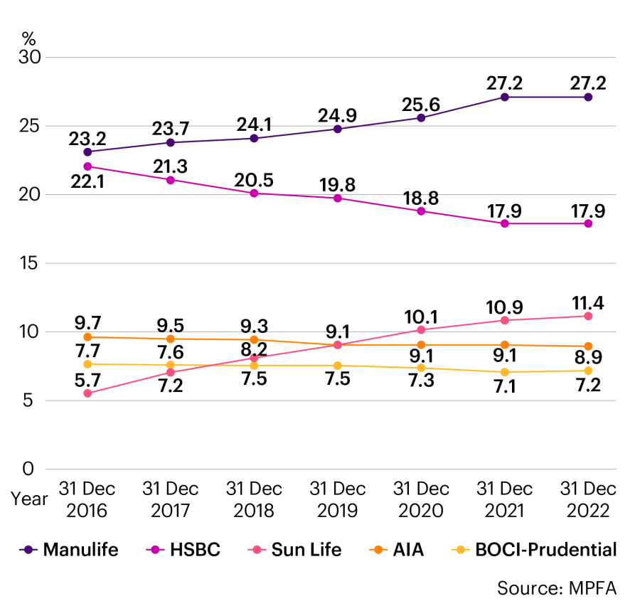 Do you know how your MPF sponsor ranks in terms of market share within the entire MPF market? The first chart provides the distribution information in Hong Kong as at December 31, 2022. The second chart shows the change in the distribution of the 5 largest MPF sponsors since 2016.