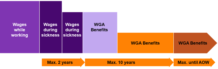 The allocation of these WGA benefits is capped at 10 years. Together with the obligation to continue to pay wages during the first 2 years, the employer is financially responsible for the disabled employee for a period of 12 years. Employers are therefore financially encouraged to limit inflows into the WGA, or to shorten the benefit period.