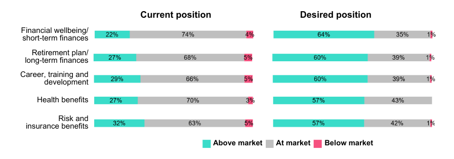 More than half of employers enhance their benefits in financial wellbeing, retirement plan, career, training and development at market level whereas the desired position in the next two years for the following benefits relative to its main competitors is to be above the market.