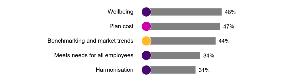 When asked to identify the top three most important benefits strategy issues across the five dimensions, Thailand had wellbeing as their top focus, following by plan cost and benchmarking and market trends.