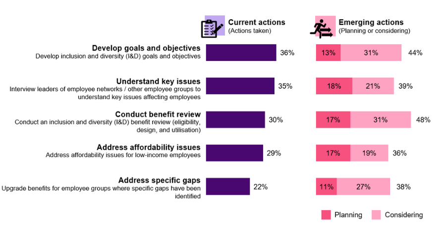 Diversity, equity and inclusion (DEI) was the top priority for employers in Asia Pacific two years ago, and it continues to be a focus, building on the growing understanding that creating inclusive workplaces have ramifications that go beyond the immediate acceptance that employees feel. In Thailand, more than a third (35-36%) of employers have begun to develop their DEI objectives and understand key issues, and approximately a half is planning or considering conducting a benefits review through a DEI lens.