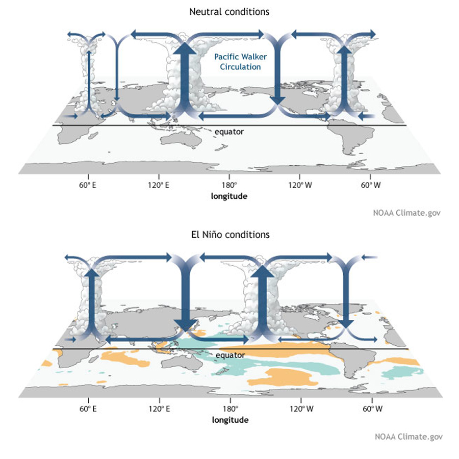 Figure 1. Generalized Walker Circulation (December-February) during ENSO-neutral conditions and Generalized Walker Circulation (December–February) anomaly during El Niño events, overlaid on map of average sea surface temperature anomalies.