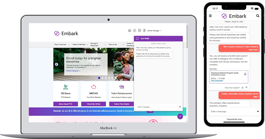 The Embark Virtual Assistant is secured and powered by Microsoft Azure AI technologies. It provides conversational responses that are relevant to the individual and customized to your organizational style, tone, and culture. The generative AI answers questions in the user’s local language and cites its sources, ensuring all chat responses are relevant to the individual.
