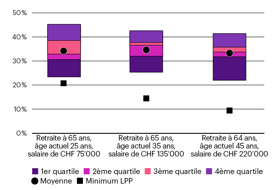 L’étude SLI montre que même si toutes les entreprises offrent des prestations de prévoyance élevées, les résultats varient considérablement d’une entreprise à une autre. Comme dans les études précédentes, WTW a défini trois profils types d’employés et a calculé leur rente projetée en pourcentage du salaire de base à la retraite.