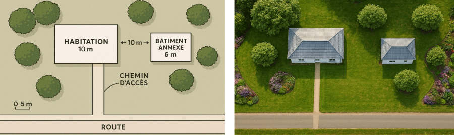 Pour une habitation comprenant plusieurs structures, l’IA peut analyser leur proximité et simuler, par exemple, un risque de propagation d’incendie entre deux bâtiments.
