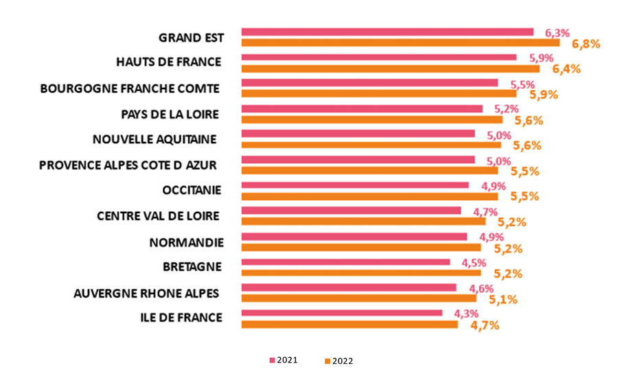 - Le Grand Est reste la région la plus touchée, avec le taux d’absentéisme (6,8%, en hausse de 9%), la prévalence (47,65% des salariés ayant eu au moins un arrêt dans l’année) et la fréquence les plus élevés (1,87 arrêt par salarié). Les Hauts de France (taux d’absentéisme de 6,4%, en hausse de 8%) et la Bourgogne Franche-Comté (5,9%, en hausse de 7%) se situent respectivement à la deuxième et troisième place parmi les régions les plus impactées par l’absentéisme.