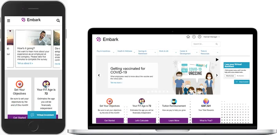 Embarkは、従業員セグメントごとにカスタマイズされた情報を見られる社内サイトであり、PCおよびモバイルの両方に対応している為、出先や個人PCの無い場合でも、すぐに必要な情報が一元管理されているプラットフォームにアクセスすることができます。