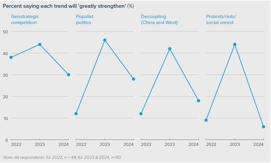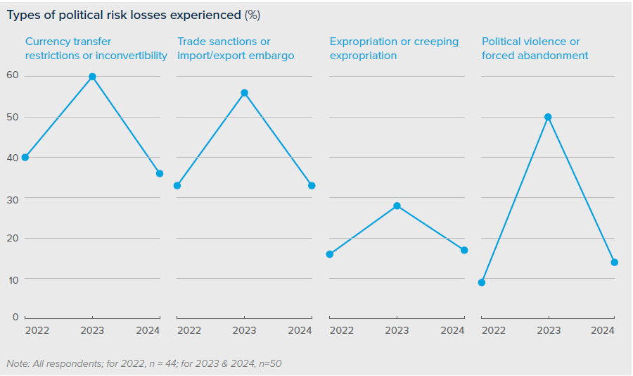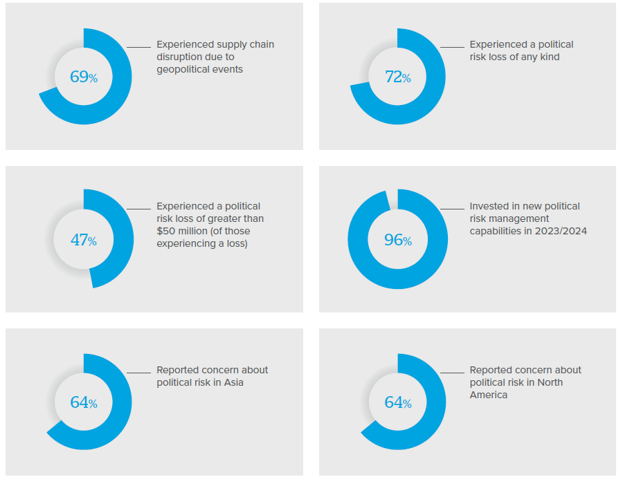 確かに前回調査時のポリティカルリスクと地政学的傾向に関するがパニック的な見方は弱まりましたが、今回の調査では回答者の30%が「地政学的紛争」が今後大幅に悪化すると見ており、他の地政学的傾向についても約15%が同様に悪化すると考えています。同時に回答者はポリティカルリスクについて楽観的ではなく、96%が2024年に入って新しいポリティカルリスクマネジメント機能を追加したと述べています。また、70%以上がポリティカルリスクによる損失を経験しており、また、大多数がアジア、ヨーロッパ、ロシア、中東、北米でのポリティカルリスクを特に懸念していると報告しています。