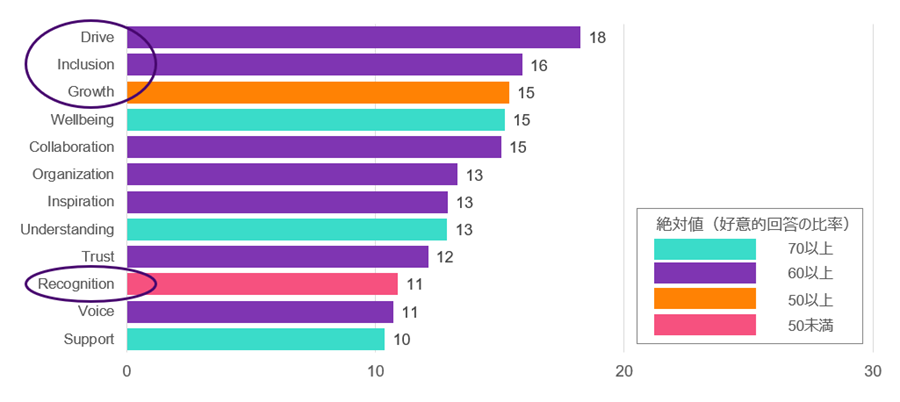 4つ目として、「Recognition:公正かつ公平な認知と報酬が得られているか」があげられる。これについては、グローバル基準値との差異はさほど大きくはないが、絶対値において12項目中最低であり、過去5年程度のスパンで見ても最低スコアが継続されている領域である。インフレや政府の方針も踏まえて、新卒者の給与引き上げを中心として、報酬水準の改定や従来よりも高い水準での賃上げに着手されている企業も多く観察される。一方で、自分の貢献が公正・公平に評価・認知され、それが適切な報酬につながっているかという実感を従業員が得られているかというと、そこまでのインパクトにはつながっていない状況と言える。