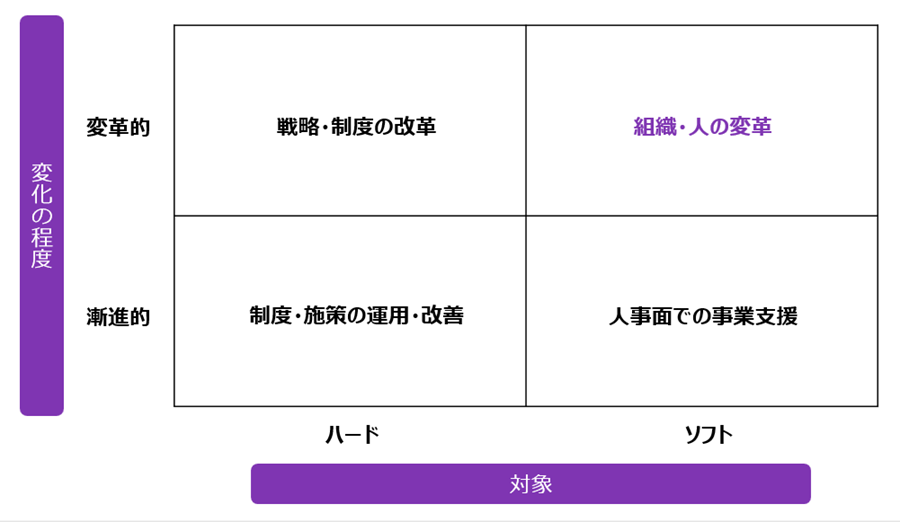 人事の主な取組は、その変化の程度と対象によって分類することができる。変化の程度は、漸進的に進めるのか、大きな変革を行うか。対象は、ハードを扱うか、ソフトを扱うか。この2軸によって、以下のように4つに分けられる。(図2)