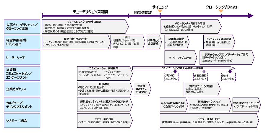 M&Aにおける組織・人事上の課題は下記図の通り、デューデリジェンス~買収契約締結以降のPMIの各段階において存在する。