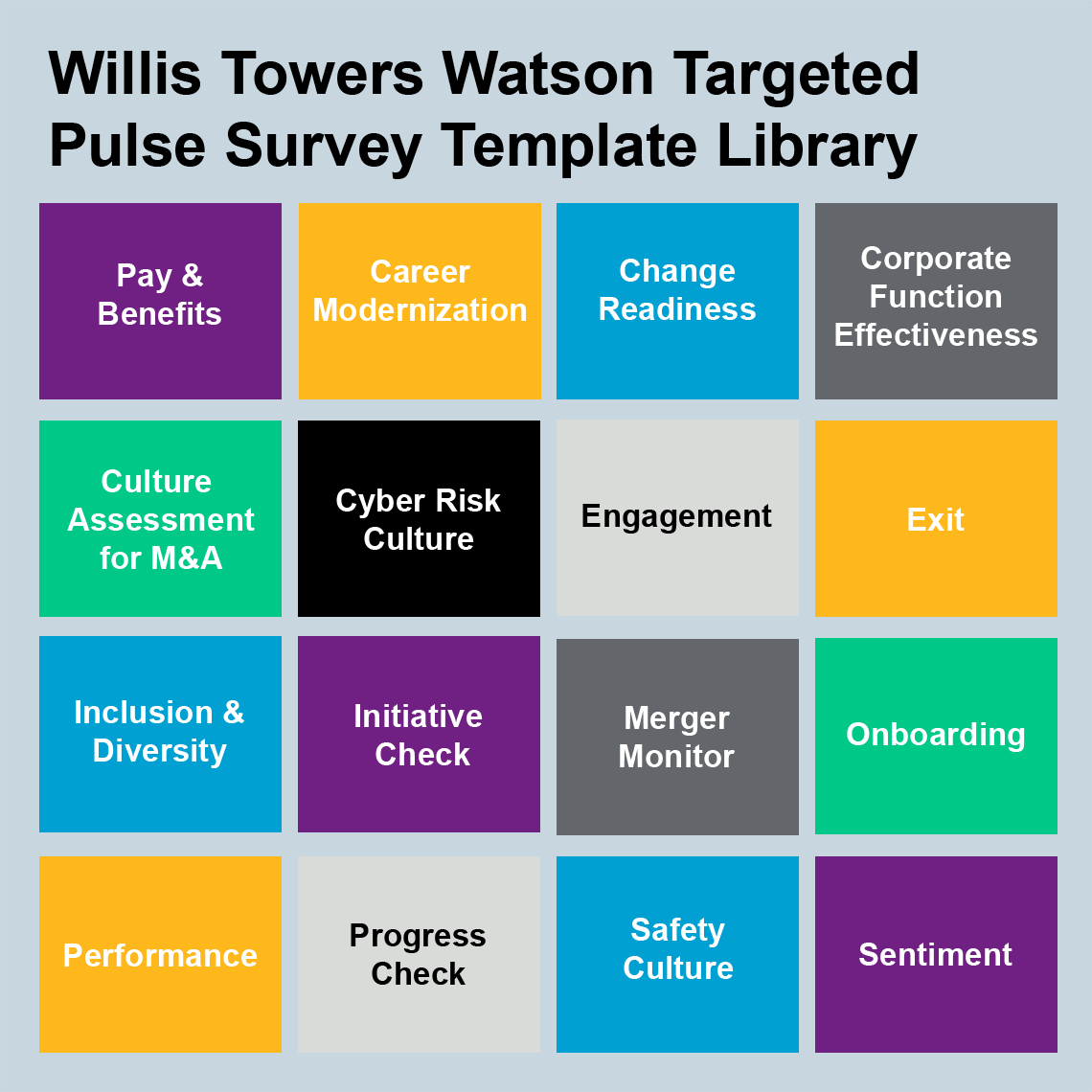 - 弊社のInclusion & Diversity (I&D), Cyber Risk Culture 、Onboardingなどの豊富なサーベイ・テンプレート・ライブラリーを使用して、最適な設問設計・調査の実行が可能です。