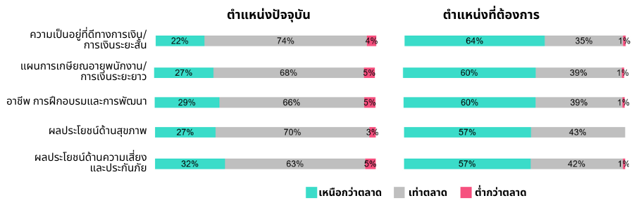 นายจ้างมากกว่าครึ่งปรับผลประโยชน์ในด้านความเป็นอยู่ที่ดีทางการเงิน แผนการเกษียณอายุพนักงาน อาชีพ การฝึกอบรมและการพัฒนาให้อยู่ในระดับเดียวกับตลาด ในขณะในอีก 2 ปีข้างหน้านายจ้างปรารถนาที่จะปรับเพิ่มผลประโยชน์พนักงานในทุก ๆ ด้าน ให้สูงกว่าตลาด