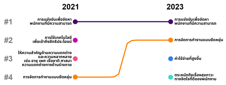 การแข่งขันเพื่อจัดหาพนักงานที่มีความสามารถและการจัดการทำงานแบบยืดหยุ่นเป็นประเด็นสำคัญที่มีอิทธิพลต่อกลยุทธ์ด้านผลประโยชน์ การแข่งขันเพื่อจัดหาพนักงานที่มีความสามารถนั้นยังคงเป็นประเด็นปัญหาที่ไม่มีทีท่าว่าจะหมดไปในประเทศไทย และยังเป็นปัญหาอันดับ 1 สำหรับนายจ้างเมื่อ 2 ปีที่แล้ว (รูปที่ 1) การจัดการทำงานแบบยืดหยุ่นขยับขึ้นเป็น 2 อันดับแรก ในขณะที่ประเด็นสำคัญอื่น ๆ ที่มีอิทธิพลต่อกลยุทธ์ด้านผลประโยชน์และสวัสดิการในประเทศไทยกำลังมุ่งไปที่ค่าใช้จ่ายและปัญหาสุขภาพจิตที่เพิ่มขึ้น มากกว่าการใช้เทคโนโลยีเพื่อให้พนักงานเข้าถึงผลประโยชน์ได้อย่างสะดวกขึ้นและการมุ่งเน้นผลประโยชน์เพื่อสนับสนุนการยอมรับความแตกต่างและความหลากหลาย