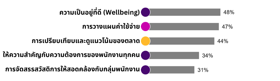 เมื่อต้องระบุประเด็นกลยุทธ์ด้านผลประโยชน์ที่สำคัญที่สุด 3 อันดับแรกในทั้งหมด 5 มิติ ประเทศไทยมุ่งเน้นเรื่องความเป็นอยู่ที่ดีของพนักงานมากที่สุด รองลงมาคือการวางแผนค่าใช้จ่ายและการเปรียบเทียบและดูแนวโน้มของตลาด