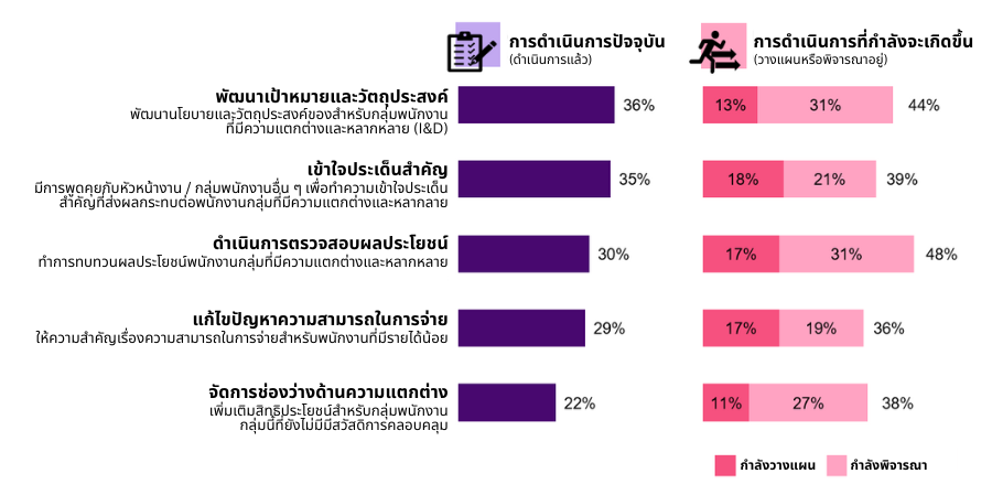 ความหลากหลาย ความเสมอภาค และการยอมรับ (Diversity, Equity and Inclusion: DEI) เป็นสิ่งที่นายจ้างในเอเชียแปซิฟิกให้ความสำคัญสูงสุดเมื่อ 2 ปีที่แล้ว และยังคงให้ความสนใจมาอย่างต่อเนื่อง ด้วยความเข้าใจที่ว่าการทำให้สถานที่ทำงานมีการสนับสนุนการยอมรับความแตกต่างซึ่งกันและกันนั้น จะช่วยสร้างความผูกพันที่พนักงานมีต่อองค์กร ในประเทศไทย นายจ้างมากกว่าหนึ่งในสาม (35-36%) ได้เริ่มพัฒนาวัตถุประสงค์ DEI และเข้าใจประเด็นสำคัญ และประมาณครึ่งหนึ่งกำลังวางแผนหรือพิจารณาเพื่อดำเนินการทบทวนผลประโยชน์ผ่านแนวคิด DEI